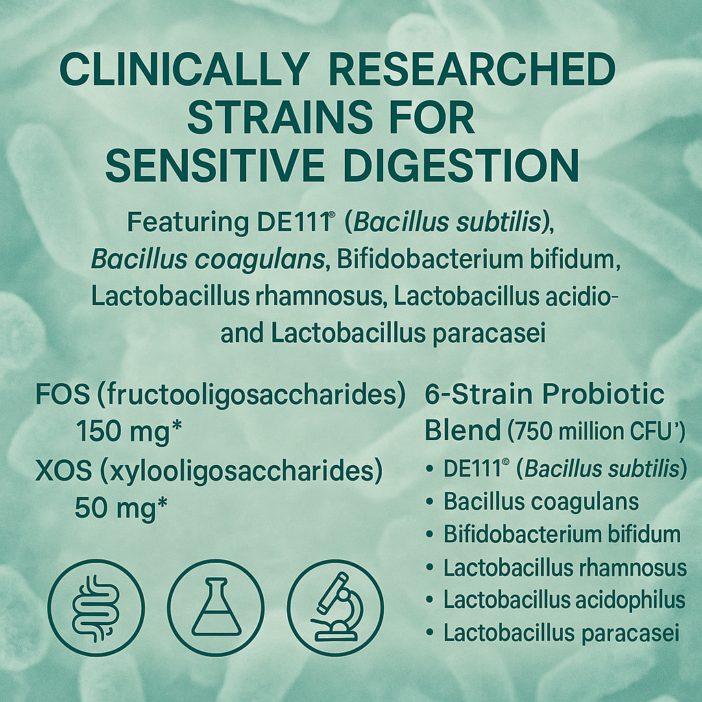It combines a carefully balanced CFU count of well-studied probiotic strains – including DE111® Bacillus subtilis, Bacillus coagulans and Lactobacillus rhamnosus – with two gentle prebiotic fibers (FOS and XOS) to nourish your microbiome in a calm, predictable way.
