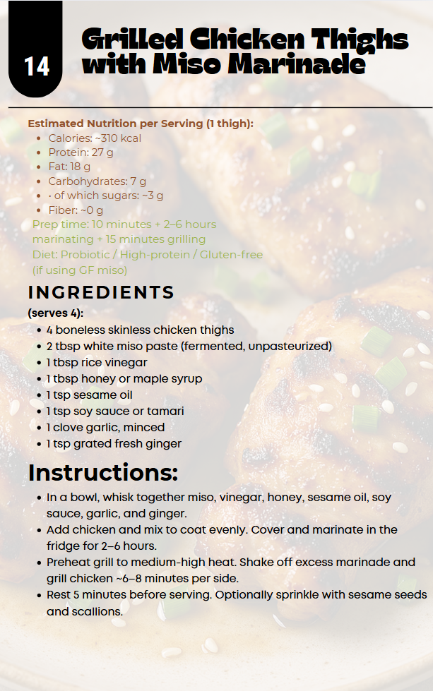 Forget the heavy, bloating BBQs of the past. This eBook is your fresh new take on grilling — where bold flavor meets real gut health. Whether you're flipping burgers or roasting veggies, each of these 50 recipes is powered by live cultures, fermented ingredients, and natural probiotic boosters.